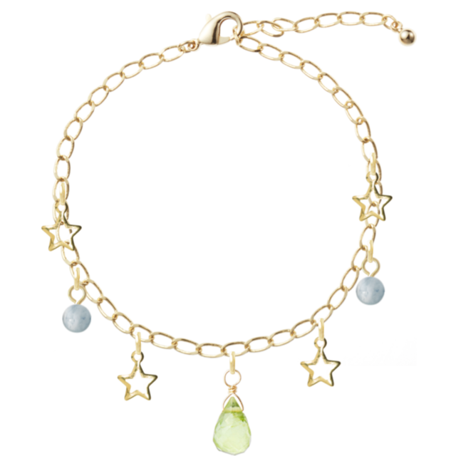 ゆらゆら揺れる天然石ペリドットは、前向きな気持ちにさせてくれると言われています。スターのモチーフとアクアマリンが癒しと幸せを運んできます。
